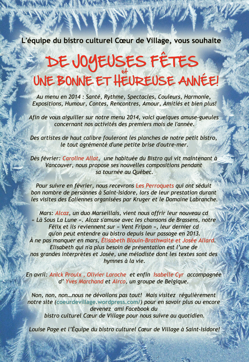 Nos Meilleurs Voeux pour 2014. 17 décembre 201328 juin 2016Coeur de village Poster un commentaire Et une relâche bien mérité pour tous les bénévoles! Prochain spectacle dimanche 02 février 2014, Avec Lyne Cadieux et aux murs du bistro Tali Lesvesque. Partager : Partager sur X(ouvre dans une nouvelle fenêtre) X Partager sur Facebook(ouvre dans une nouvelle fenêtre) Facebook J’aime chargement…